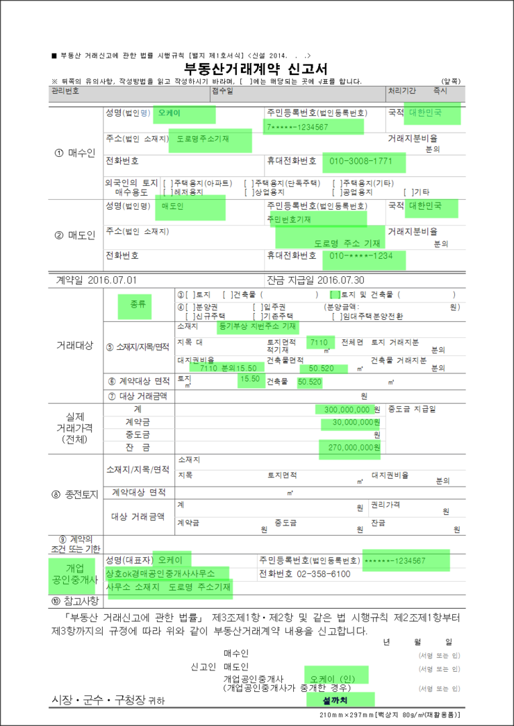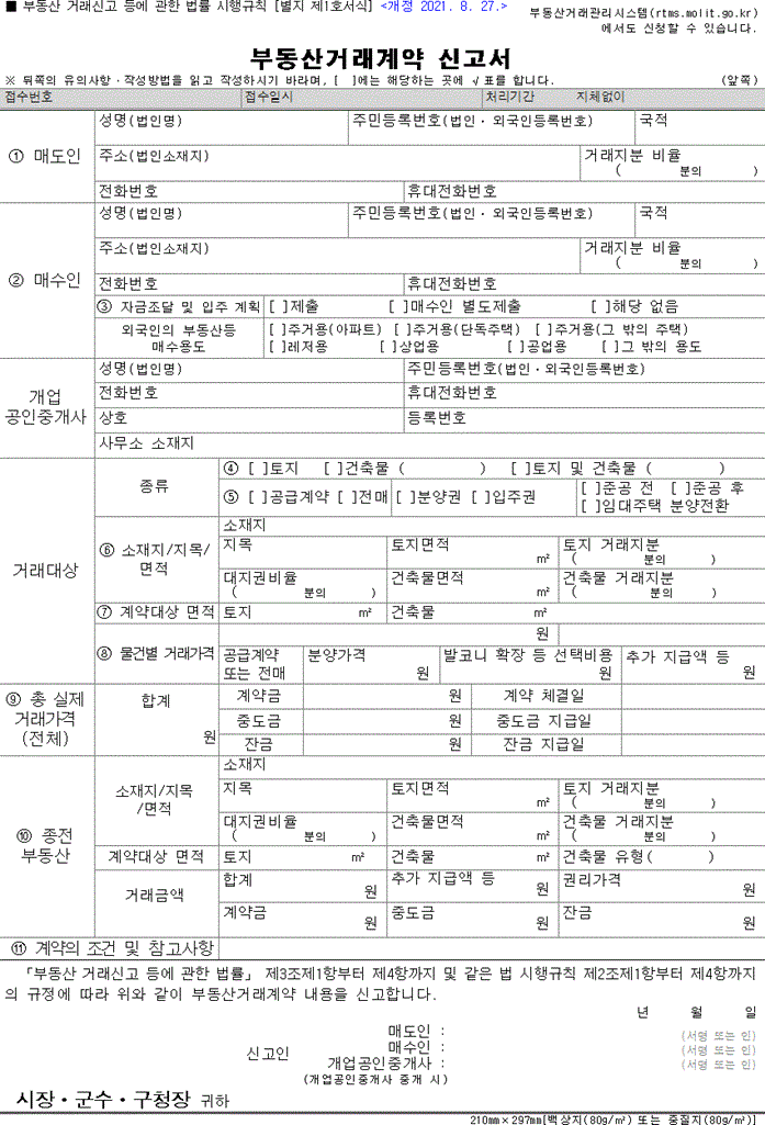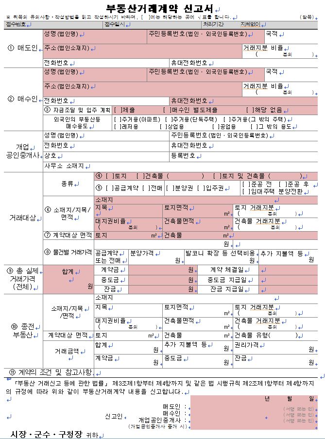 부동산 거래 계약 시 #부동산 거래 계약 신고서 서류를 미리 준비하여 하단 매도인란에 미리 날인해 두면 편리합니다.(도장이 아니더라도 상관없다) 1번부터 2번은 인적사항을 적으시면 되고, 3번은 주택의 경우만 체크 4~7번까지 작성하실 때는 등기부등본을 출력하여 참고하시면 편리합니다. 특히 7번에 계약대상면적 중 토지는 토지면적*토지권비율을 넣어 실제 계약하고자 하는 건물의 부지지분면적을 넣어야 합니다. 일반계약의 경우 계약금/잔금만 작성하면 되는거죠? 그렇게 저도 작성해보겠습니다…